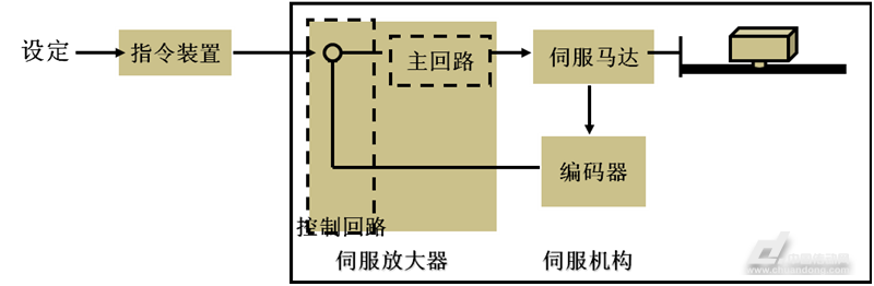 伺服系統是指:以物體的位置、方位、姿勢等為控制量,組成能跟蹤目標的任意變化的控制系統。下圖是一個伺服系統的主要構成部分: